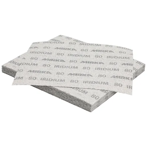 Large sheets for hand sanding on putty, wood, paint, solid surface, and lacquers. Perfect for wood sanding, paint removal, stock removal, and intermediate sanding. Iridium is perfected for speed and efficiency, with the capability to repel dust. Its precision coating prevents clogs and reduces pilling, maintaining the sharpness of the abrasive grains.