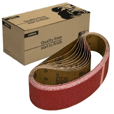Mirka Hiolit XO 4″ x 24″ Portable T-Joint Sanding Belts (57-4-24 Series) are a semi-open stiff universal abrasive for belt sanding and other machine sanding where it has excellent edge wear resistance and durability.